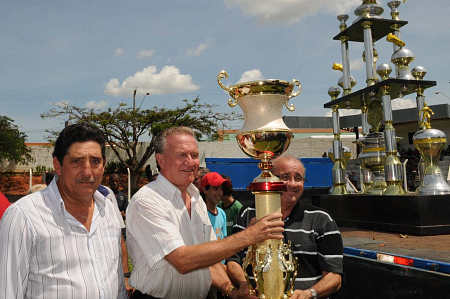 O Prefeito Nelson Pinel (ao centro) fez a entrega do troféu de Campeão à equipe Ouroeste, campeã da 23ª Edição da Copa Brasilândia. O troféu transitório em cima do caminhão pesa cerca de 150 quilos, e só fica em definitivo com a equipe que vencer a Copa três vezes consecutivas. |