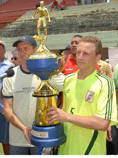 O craque Vô, capitação da equipe, recebeu o troféu das mãos do Secretário Municipal de Esportes Tarcisio Scanavino. |