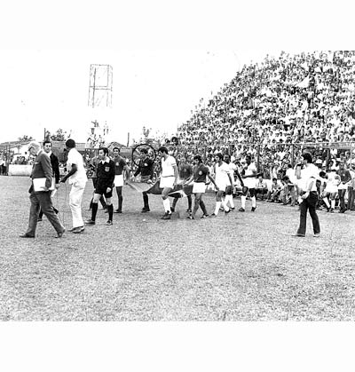 Representante da Federação Paulista de Futebol, dois auxiliares e jogadores de América e Ferroviária entram no gramado, observados pelo repórter Roberto Toledo e por uma multidão que lotou as arquibancadas do estádio Mário Alves Mendonça, em 7 de setembro de 1971. No dia seguinte, o goleiro Carlos Alberto (no círculo) morreu afogado. À frente dele está Alfredo Mostarda, do América. O jogador de branco (da Ferroviária) que segura a bandeira brasileira é o zagueiro Fernando