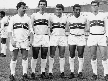 Na foto da matéria, linha ofensiva formada por Faustino, Marco Antônio, Prado, Bazaninho e Valdir, antes de um jogo do São Paulo, em 1964, no inacabado Morumbi. Atrás aparece o lateral Jurandir (6)
