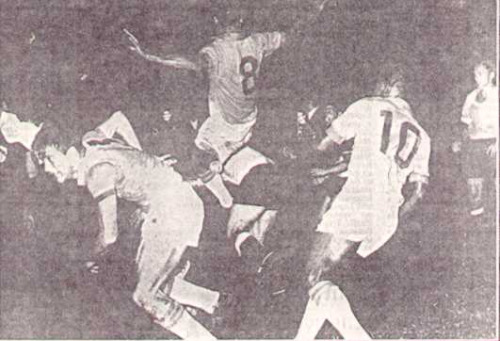Na foto: No meio dos jogadores apareceu Didi com um pulo voador para cair em cima dos uruguaios.