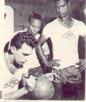 Depois do jogo entre cariocas e paulistas, Carlayle autografa a bola do jogo ao lado de Didi, o autor do único gol dos cariocas, o primeiro no maracanã.