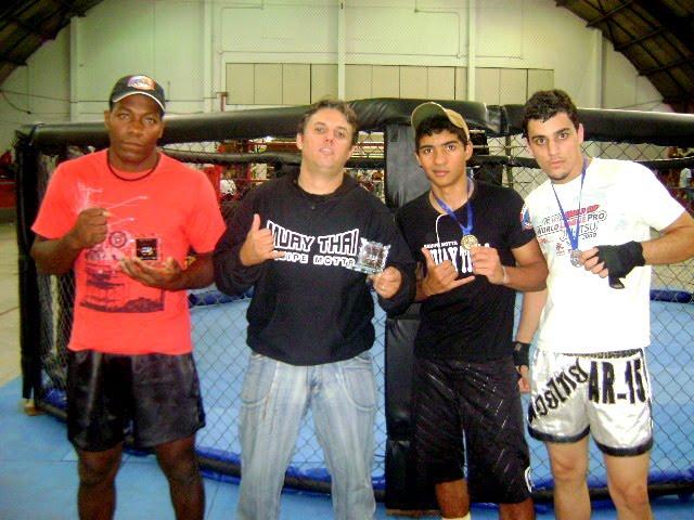 Na foto: O atleta Valter Luis (Campeão M.M.A.), Huelder Motta (prof. Destaque), o jovem Miltinho (Campeão Muay Thai) e Guilherme (vice-campeão Muay Thai)