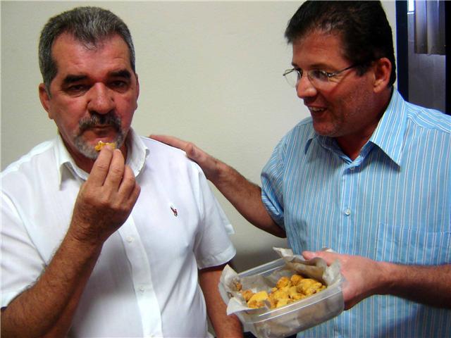 Logo depois, o corinthiano carregava uma bandeja com peixe frito e ofereceu ao santista. Aurélio Jacinto de Camargo, "Cabeção", também torcedor do Timão, acompanhou a entrega, com registro fotográfico do momento de humor. "Vamos degustar peixe no primeiro e segundo turno", antevê o corinthiano.