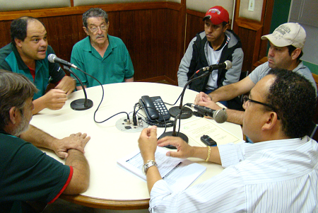 O narrador esportivo Paulo Roberto Cosso, os comentaristas Célio Mendes e Remiro Cachoeira da Rádio Independente, e representantes do Frigorífico, o Diretor Rosado e o Presidente Rodolfo, participaram neste sábado 21-8-10 do programa "Esportes em Debate", com a apresentação do advogado Dr. José Maria dos Santos. O programa vai ao ar todos os sábados das 9 às 10 horas da manhã pela Rádio Independente AM 1010. Sua opinião é muito importante para nós, ligue 3322-1666 ou 3322-1090 e participe ao vivo. |