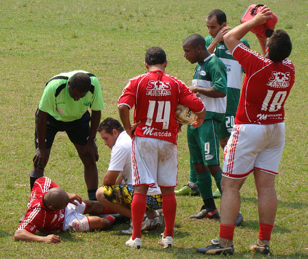 Com o forte calor que vem ocorrendo nos últimos meses em nosso país, durante o atendimento a jogadores contundidos, os demais jogadores aproveitam para beber água e se hidratarem, como se vê na foto do jogo Barretos II x Vila Marília que teve rodada dupla no campo do Rochão. |