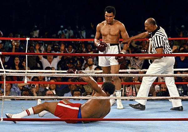 Foreman era favorito. Sete anos mais novo, havia conquistado o cinturão na temporada anterior, derrubando Joe Frazier seis vezes em dois rounds. Mas Ali arrebatou o povo do Zaire, que gritava Ali bomaye! (algo como "Ali, mate-o!"). Ele passou toda a luta apoiado nas cordas, aceitando os golpes. Depois de oito rounds, com Foreman cansado, Ali soltou uma direita explosiva e tomou o cinturão do adversário