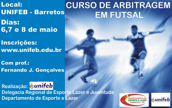 Atenção Srs. Alunos e Professores E A QUEM POSSA INTERESSAR, garatam já suas vagas no curso de Arbitragem de Fut-sal que acontece nos dia 6,7 e 8 de Maio nas dependências do Centro Universitário do UNIFEB. A iniciativa é do proprio UNIFEB, com a colaboração na realização do Departamento Municipal de Esportes e Delegacia Regional de Esportes e Lazer de Barretos. Lembrando que o curso é gratuíto, com o custo apenas da apostila(livro de regras atualizada). Excelente oportunidade para reciclar os conhecimentos e se interar das mudanças para o ano de 2011.