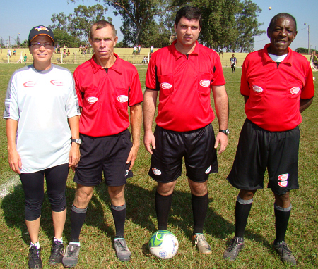 A representante Adriana, o assistente Hamilton, o árbitro Julio Magosso e o assistente Benedito Faria, atuaram no jogo que terminou empatado em 1x1 entre as equipes Camarões e Barretos II.
