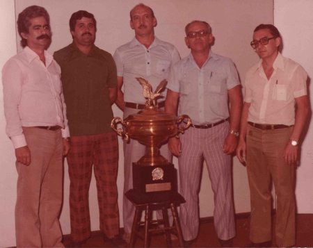 Na foto apresentam à imprensa o troféu destinado ao campeão da Copa Rural Regional promovido pela Liga Barretense de Futebol no ano de 1977, primeiro ano da gestão de Roberto Camiseiro.