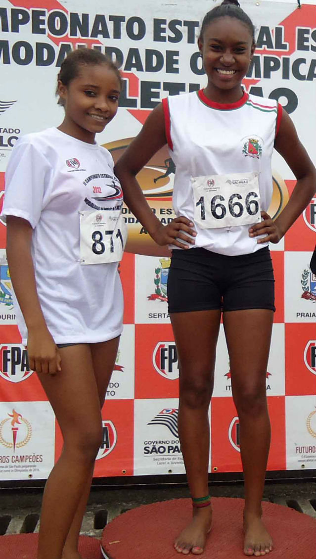 Os atletas do DEL (Departamento de Esportes e Lazer) da Prefeitura de Barretos, Lorraine de Castro, estudante da Escola "Fábio Junqueira Franco" e Taiane de Lima, da Escola "Vallois Scortecci", conquistaram a medalha de ouro na 10ª Etapa do Campeonato Escolar de Atletismo, disputado em Praia Grande, no dia 4 de setembro/12.