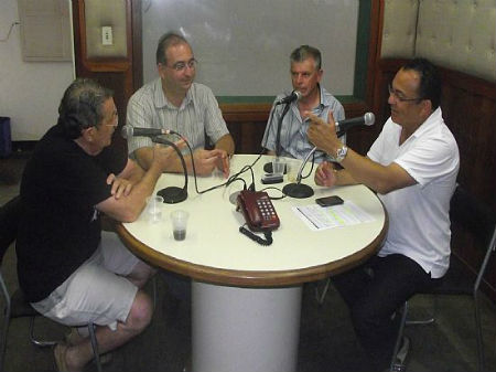 Na foto, o treinador ao lado do assessor de imprensa, Roberto José Minuncio e os apresentadores Remiro e José Maria. |