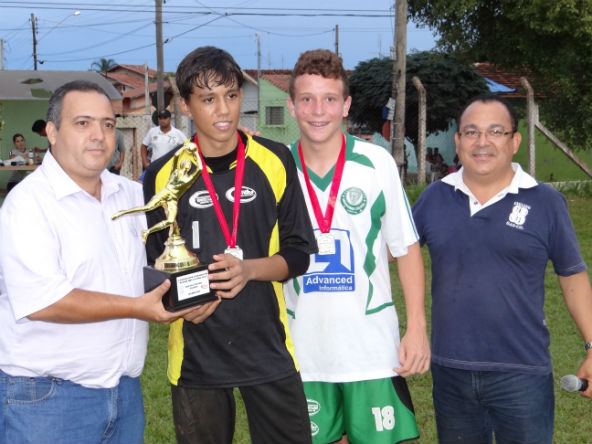 Das mãos do repórter Mazinho Dias o goleiro Vitor e o zagueiro Marco Aurélio, ladeados pelo presidente Dr. Jose Maria dos Santos, receberam as honras representadas pelo troféu.