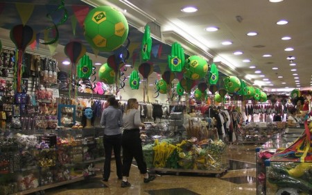 Com as gôndolas cheias de apitos, bandeiras, bolas, arcos para a cabeça, pompons e cornetas, os comerciantes têm recorrido a promoções ou guardado os produtos para o final do ano, quando a Copa do Mundo de 2014 estará mais próxima.