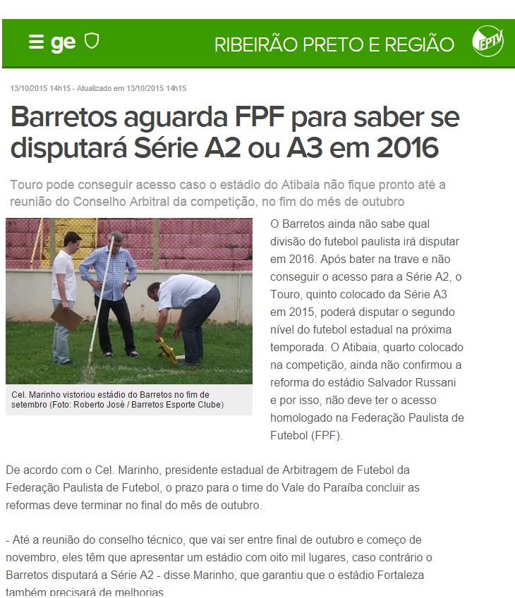 Publicado nesta Terça Feira 13/10 no Site da globo.com uma matéria onde o Cel. Marinho explica que o Atibaia tem até o final do mês para apresentar seu estádio com 8 mil lugares, reforma complicada não só pelo investimento que gira em torno de 6 milhões, mas também pelo tempo de 20 dias até o conselho técnico para entregar as respectivas reformas que ainda nem foram iniciadas.