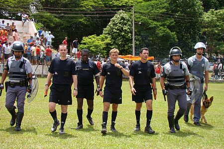 A Polícia Militar esteve presente nos jogos do varzeano, realizados no campo do BEC e no frigorífico (foto). Também dando apoio a qualquer incidente, o SAMU esteve presente com ambulência, médicos e enfermeiros. A mesma estrutura de segurança (Polícia Militar e SAMU) será prestada aos abnegados do futebol varzeano nos jogos da final.