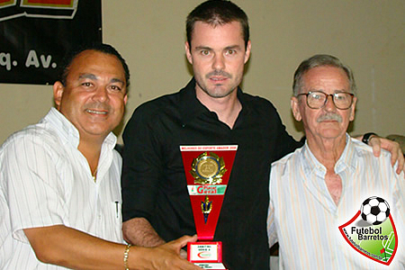 Eduardo Ribeiro, o Dudu (foto) recebeu das mãos do Presidente da Comissão Disciplinar da Liga Barretense de Futebol, Dr.José Maria dos Santos, o troféu de melhor árbitro do varzeano 2008. Dudu fez questão de receber o troféu juntamento com seu pai e ídolo, o radialista Everton Ribeiro. Parabéns.